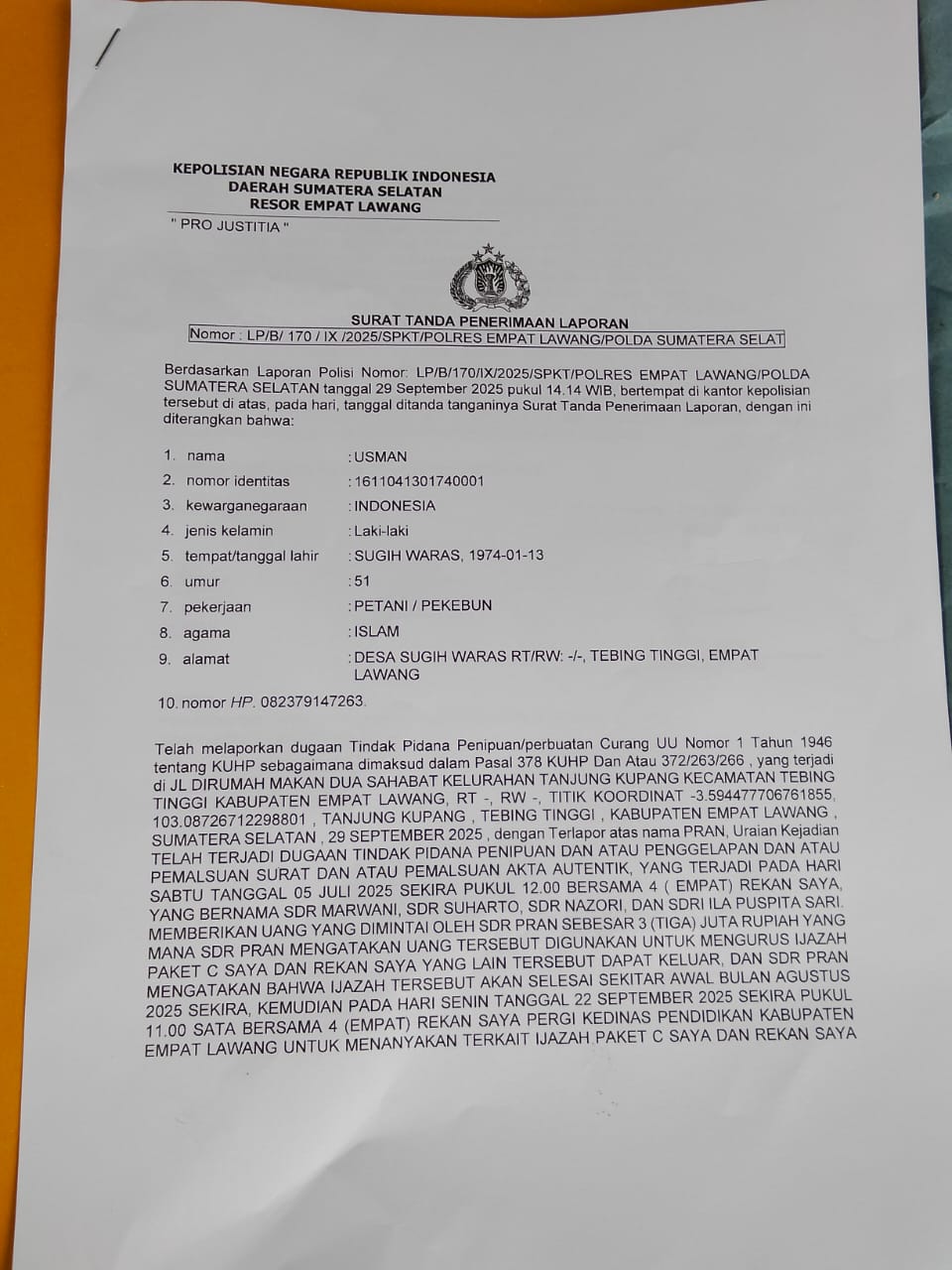 Diduga terlibat Pembuatan Ijasah Palsu oknum PPPK di Laporkan ke Polres Empat Lawang