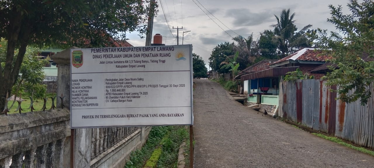 Peningkatan Jalan Desa Muara Saling kabupaten empat Lawang Dengan No kontrak,600/022/SPPP-APBD/PPK,BM/DPU-PR 2025 tangal 30 September 2025 Nilai Kontrak 1.996,448,000, CV, Cahaya Bangun Nusa, Tidak Menyelesaikan Pekerjaan Hinga Sampai Kontrak Berakhir,,